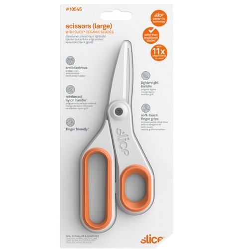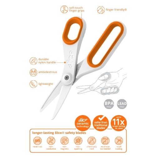 מספריים Slice® 10545 מתוכננות לבטיחות ונוחות שימוש מירבית. המספריים כוללות ידית קלת משקל עם אחיזת אצבעות רכה (Soft-Touch), המבטיחה חיתוך נוח ביד ימין או שמאל. הלהבים הקרמיים, באורך 6 ס"מ (2.4 אינץ'), כוללים את טכנולוגיית Finger-Friendly® – קצה בטיחותי החותך חומרים ביעילות, אך בטוח למגע. קצוות הלהבים מעוגלים לבטיחות נוספת. המספריים אידיאליות לשימוש ביתי (מטבח, יצירה, משרד) וכן בסביבות תעשייתיות. הלהבים הקרמיים מחזיקים עד פי 11.2 יותר מלהבים מסורתיים.
